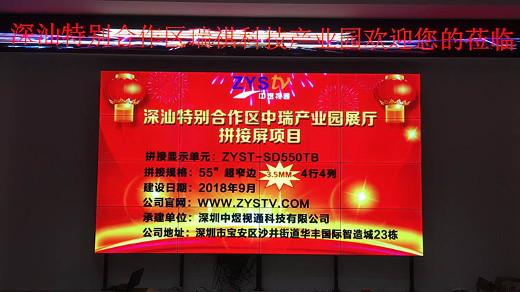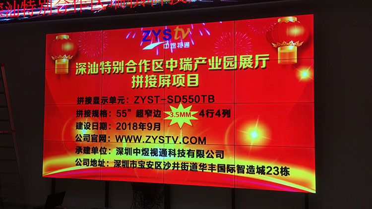 深汕特別合作區(qū)中瑞產(chǎn)業(yè)園展廳55寸3.5mm拼縫液晶拼接屏項(xiàng)目,安裝調(diào)試完成并且順利驗(yàn)收,中宇視通科技全體員工從深圳發(fā)來賀電!