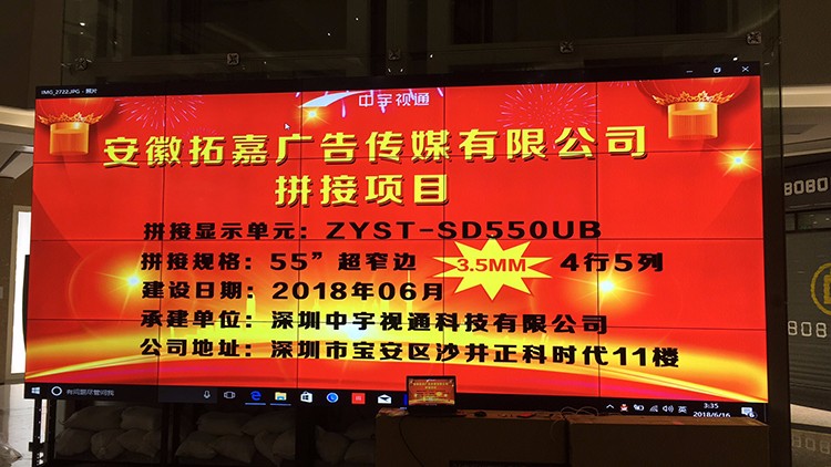 安徽九鼎傳媒有限公司此次選用中宇視通科技55寸4行5列3.5mm拼縫拼接屏項目,項目順利安裝調試完成,并且此次九鼎傳媒還會與中宇視通達成深切合作及達成長期戰(zhàn)略合作。