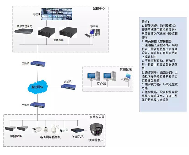 應用場景 | 64路以下的局域網(wǎng)項目。其 中,DVR用在模擬攝像機上; NVR用在高清攝像機上。 | 同左 | 局域相對集中的環(huán)境, 且必須全部是模擬攝像機 | 無論環(huán)境是集中還是分散,是幾十路還是幾千路,都可以。各種廠家,無論高清還是模擬環(huán)境,還是混雜環(huán)境,都適合 |